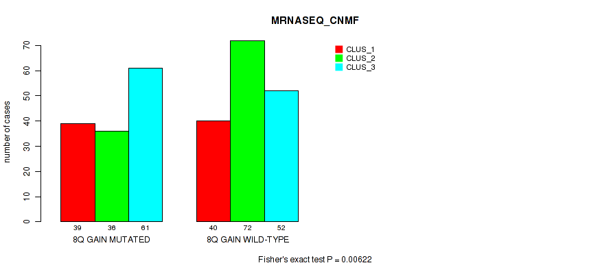 8q gain cnv correlated to 'MRNA_CNMF', 'MRNA_CHIERARCHICAL', 'MRNASEQ_CNMF', 'MRNASEQ_CHIERARCHICAL', and 'MIRSEQ_MATURE_CNMF'.
