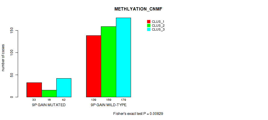 9p gain cnv correlated to 'CN_CNMF' and 'METHLYATION_CNMF'.