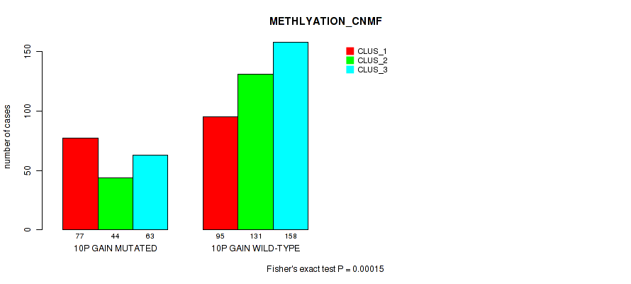 10p gain cnv correlated to 'MRNA_CNMF', 'MRNA_CHIERARCHICAL', 'CN_CNMF', 'METHLYATION_CNMF', 'MRNASEQ_CNMF', and 'MIRSEQ_CHIERARCHICAL'.