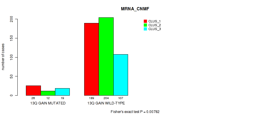 13q gain cnv correlated to 'MRNA_CNMF', 'MRNA_CHIERARCHICAL', 'MIR_CHIERARCHICAL', 'CN_CNMF', 'METHLYATION_CNMF', and 'MRNASEQ_CNMF'.