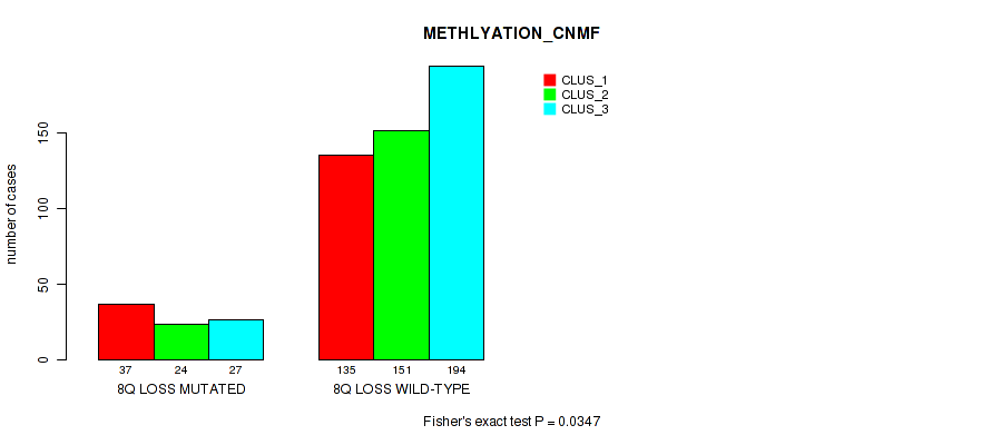 8q loss cnv correlated to 'MRNA_CNMF', 'MRNA_CHIERARCHICAL', 'CN_CNMF', 'METHLYATION_CNMF', 'MRNASEQ_CNMF', and 'MRNASEQ_CHIERARCHICAL'.