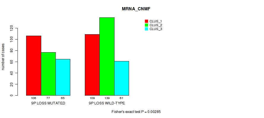 9p loss cnv correlated to 'MRNA_CNMF', 'MRNA_CHIERARCHICAL', and 'CN_CNMF'.