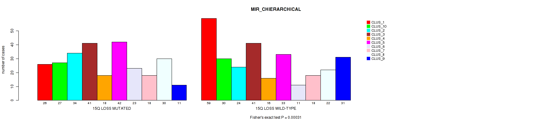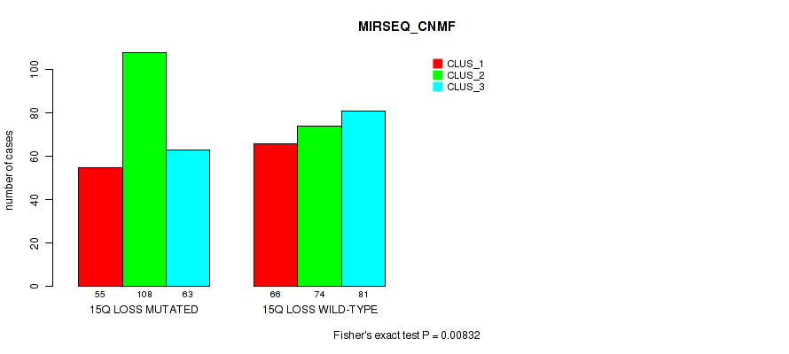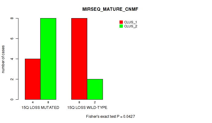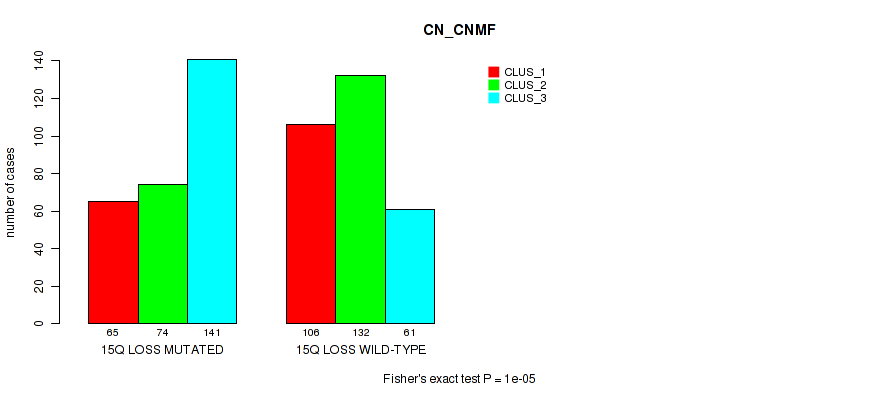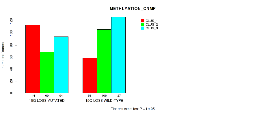 15q loss cnv correlated to 'MRNA_CNMF', 'MRNA_CHIERARCHICAL', 'MIR_CNMF', 'MIR_CHIERARCHICAL', 'CN_CNMF', 'METHLYATION_CNMF', 'MRNASEQ_CNMF', 'MIRSEQ_CNMF', 'MIRSEQ_CHIERARCHICAL', and 'MIRSEQ_MATURE_CNMF'.