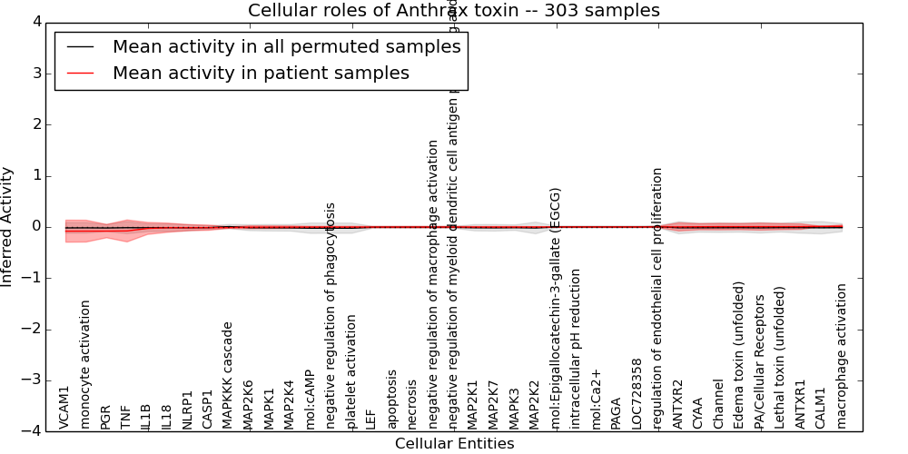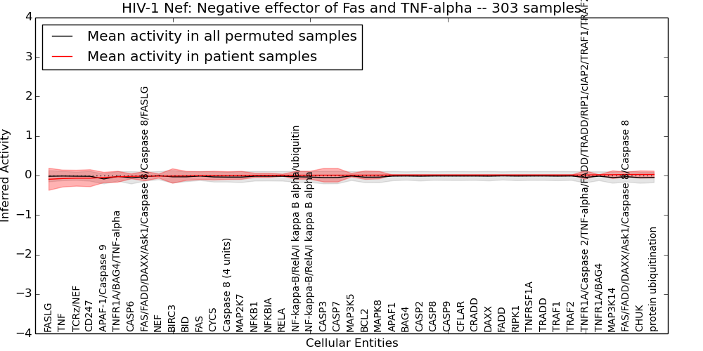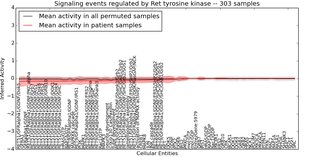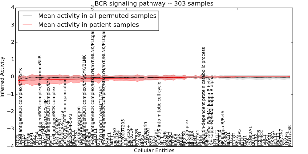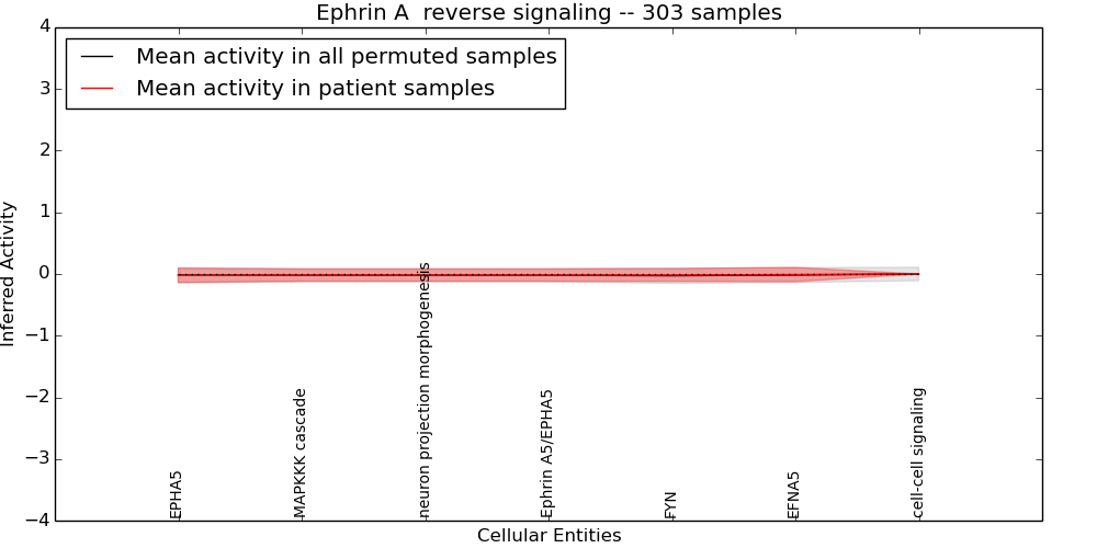 Figure S131.  Get High-res Image This plot shows pathway concept perturbations across all samples against a permutation model. The concepts along the x-axis are sorted by lowest to highest mean activity for the real patient samples. Mean inferred activities are plotted along the y-axis as a colored band showing the average level and one standard deviation range. Real samples are shown in red and permuted samples in black.