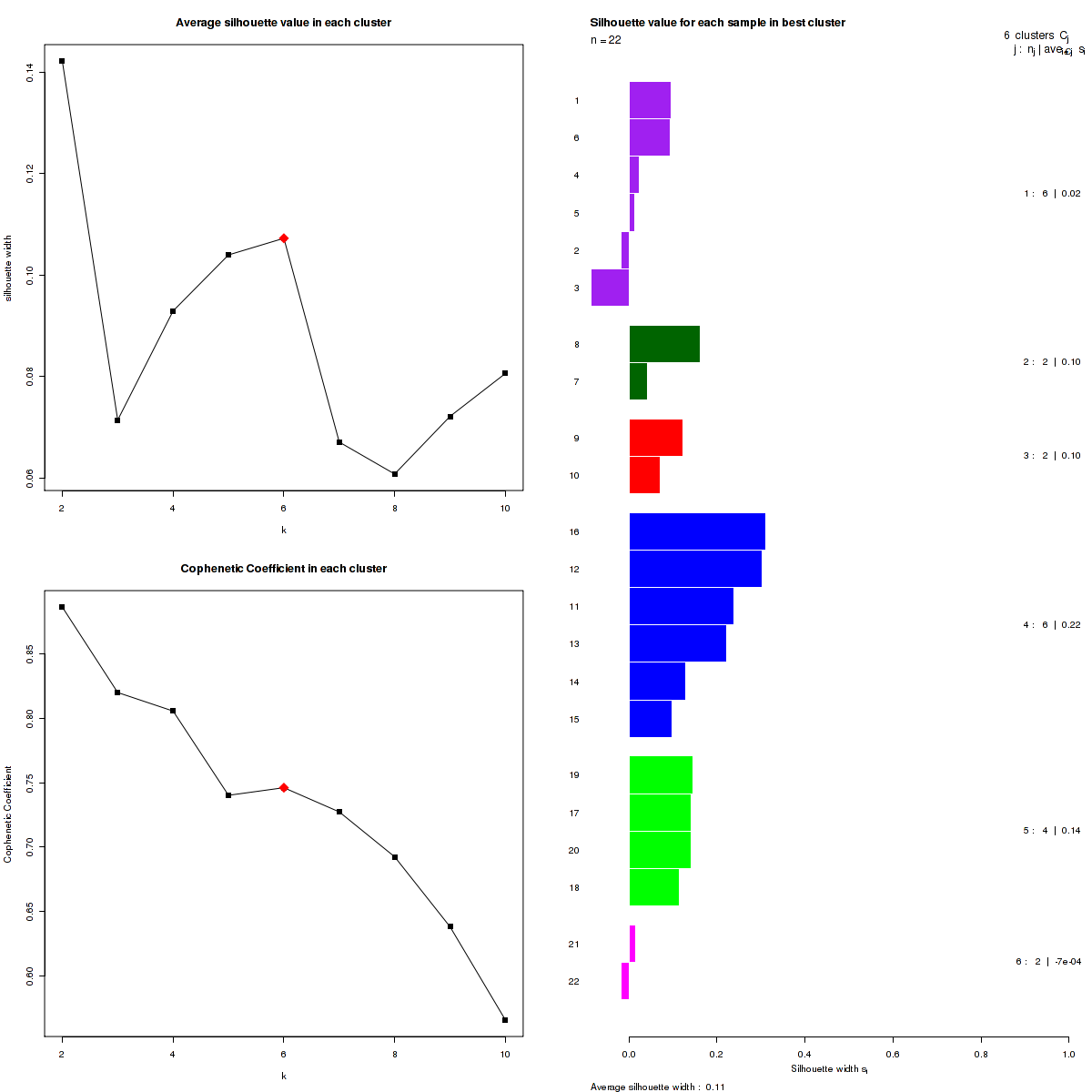 Figure 3. Get High-res Image The silhouette width was calculated for each sample and each value of k. The left upper panel shows the average silhouette width across all samples for each tested k (left upper panel). The left lower panel shows the Cophenetic Correlation Coefficients for each tested k. The right panel shows assignments of clusters to samples and the k silhouette width of each sample for the most robust clustering.