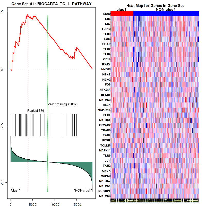 Table S1.  Get Full Table This table shows a Running Enrichment Score (RES) of each gene in this pathway, that is, the enrichment score at this point in the ranked list of genes. All genes are ranked by Signal-to-Noise (S2N), a measure of similarity as default and are used to obtain ES matrix of all genes. In this way, GSEA tool uses expression pattern of not only overlapped genes but also not-overlapped genes to produce ES matrix.