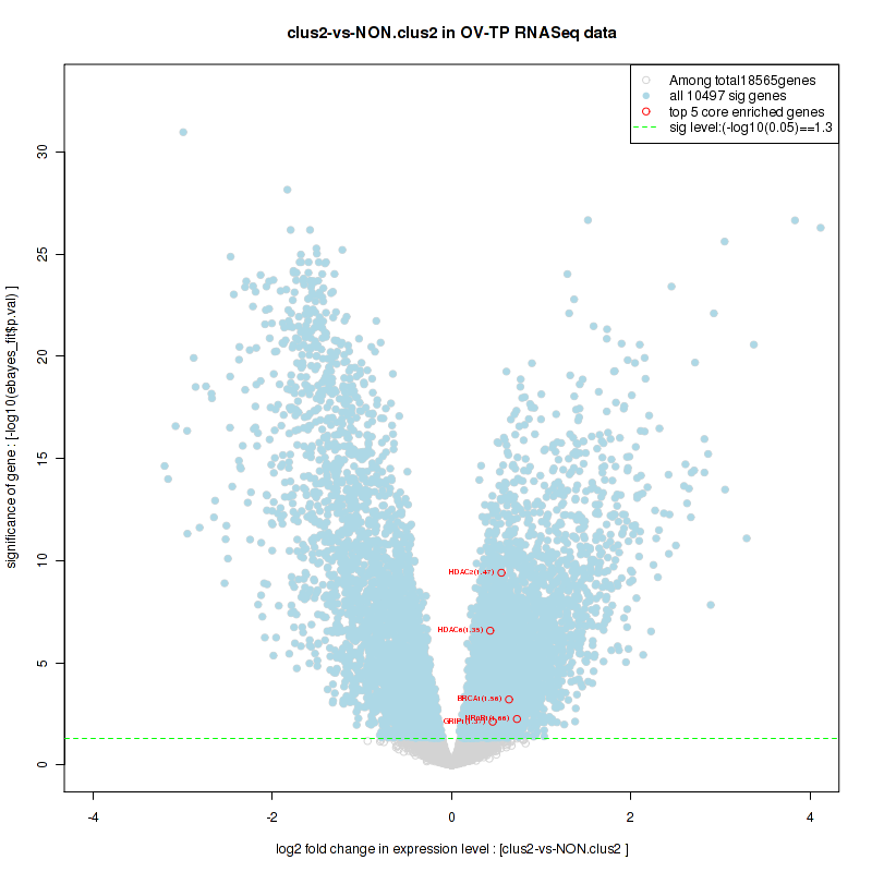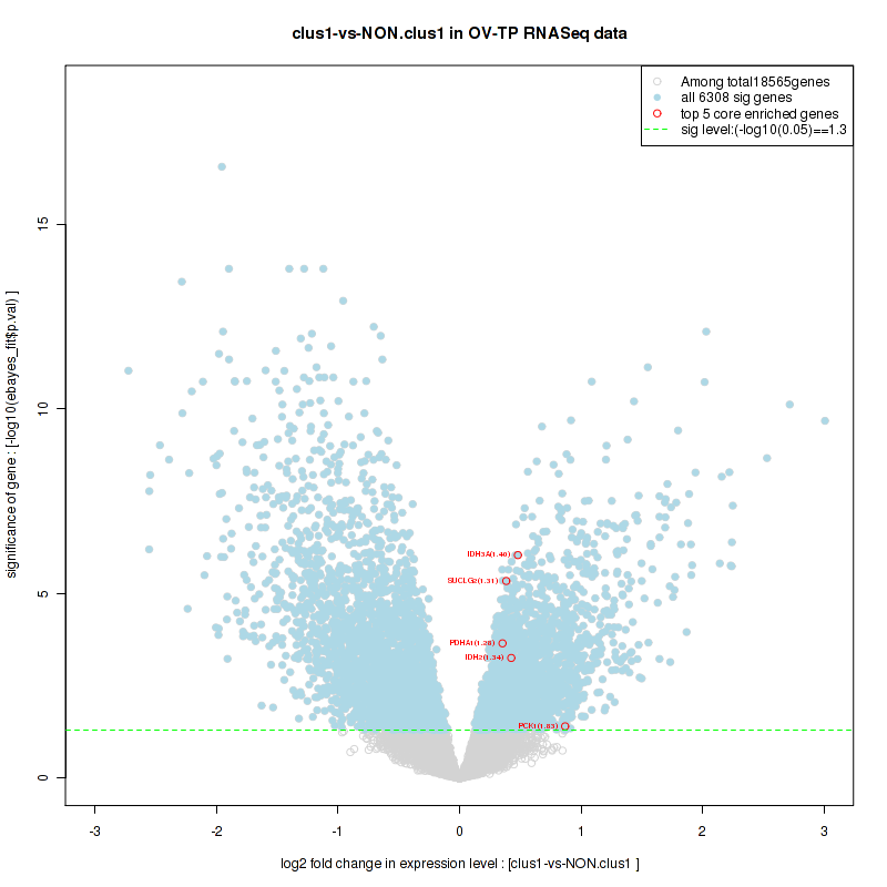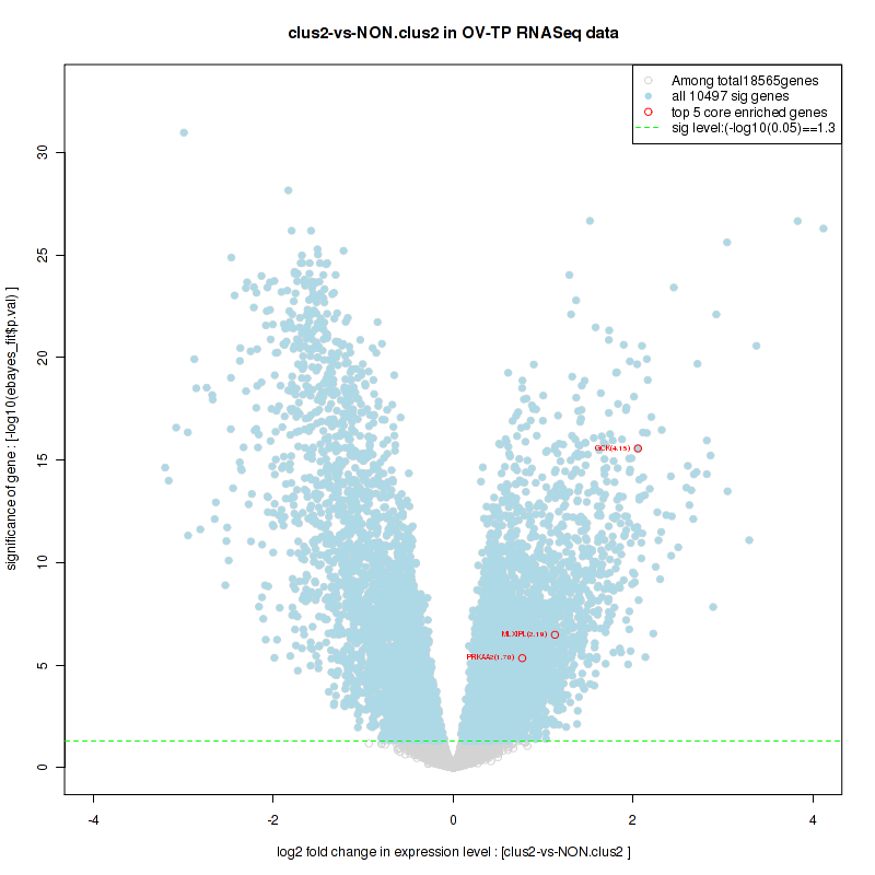 Figure S60.  Get High-res Image For the top 5 core enriched genes in the pathway: BIOCARTA FMLP PATHWAY, this volcano plot shows how much they are up/down-regulated and significant. The significance was calculated by empirical bayesian fit