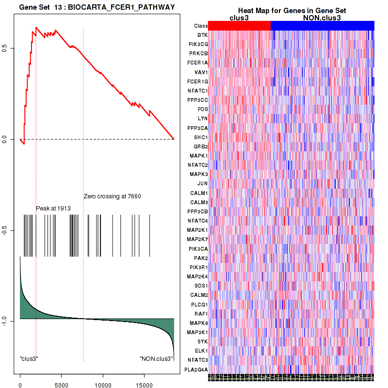 Figure S57.  Get High-res Image This plot shows mRNAseq_cNMF expression data heatmap (on the left) a RunningEnrichmentScore(RES) plot (on the top right) and a Signal2Noise(S2N) plot (on the bottom right) of genes in the pathway: BIOCARTA FCER1 PATHWAY.