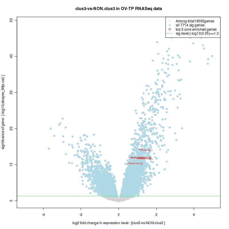 Figure S58.  Get High-res Image For the top 5 core enriched genes in the pathway: BIOCARTA FCER1 PATHWAY, this volcano plot shows how much they are up/down-regulated and significant. The significance was calculated by empirical bayesian fit