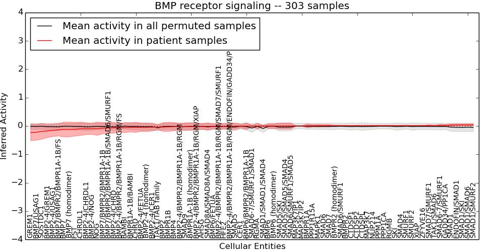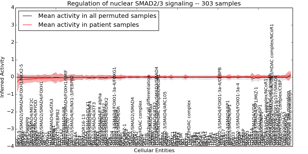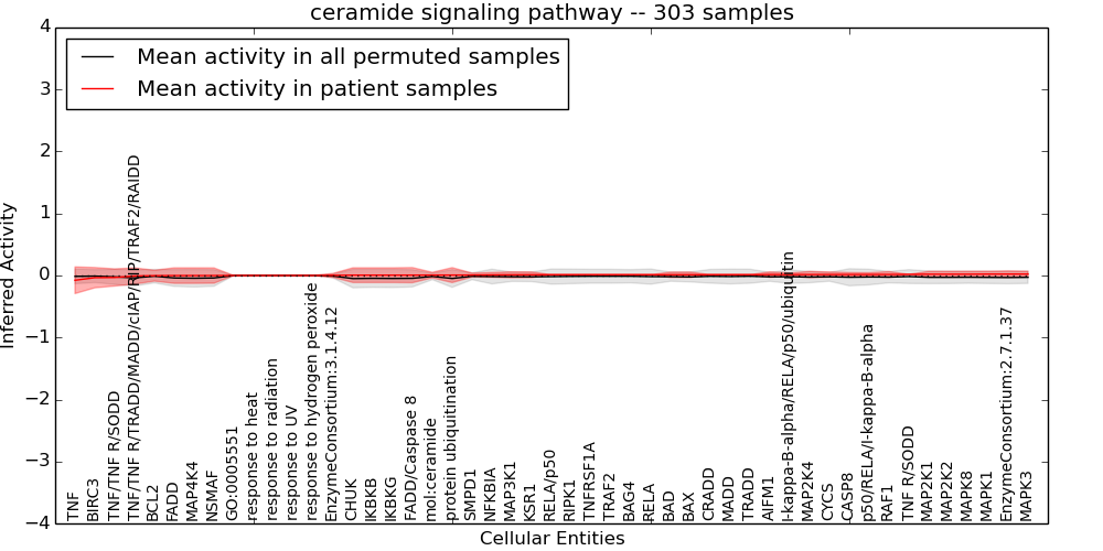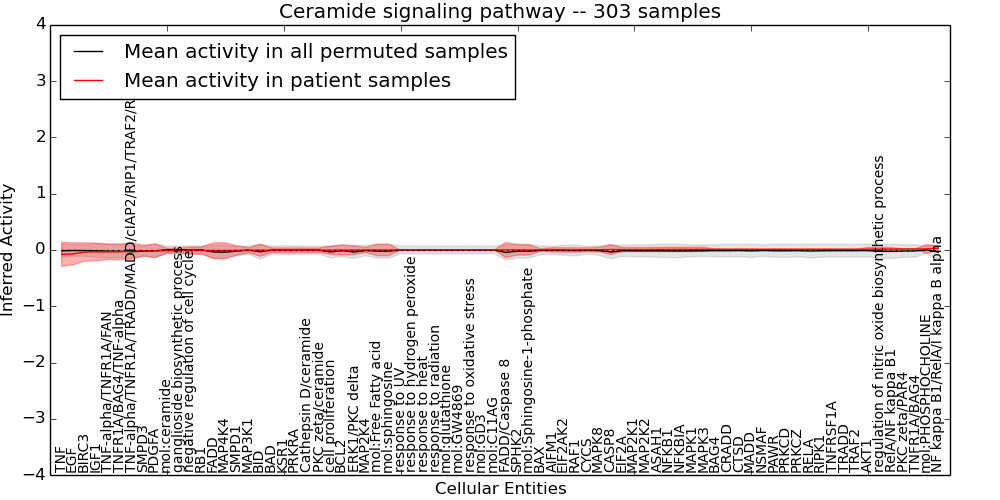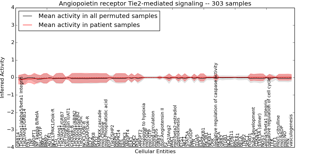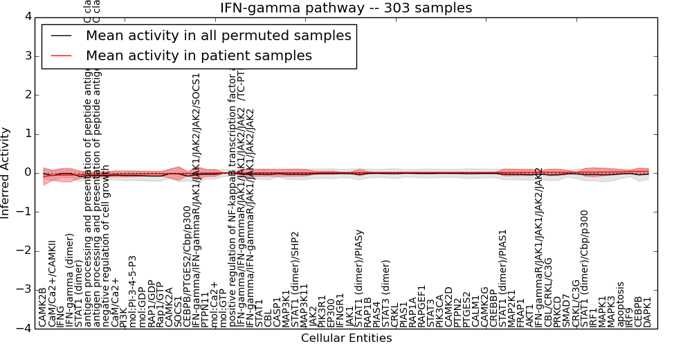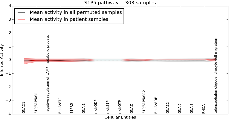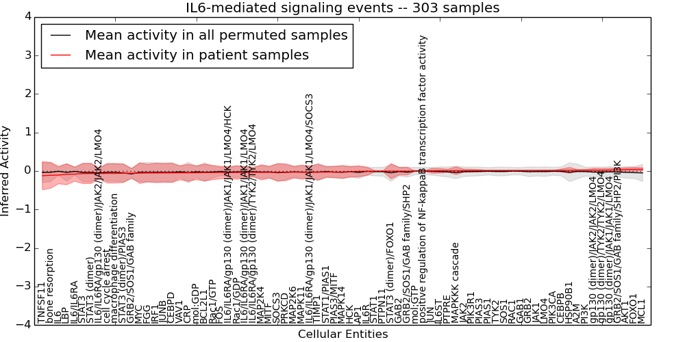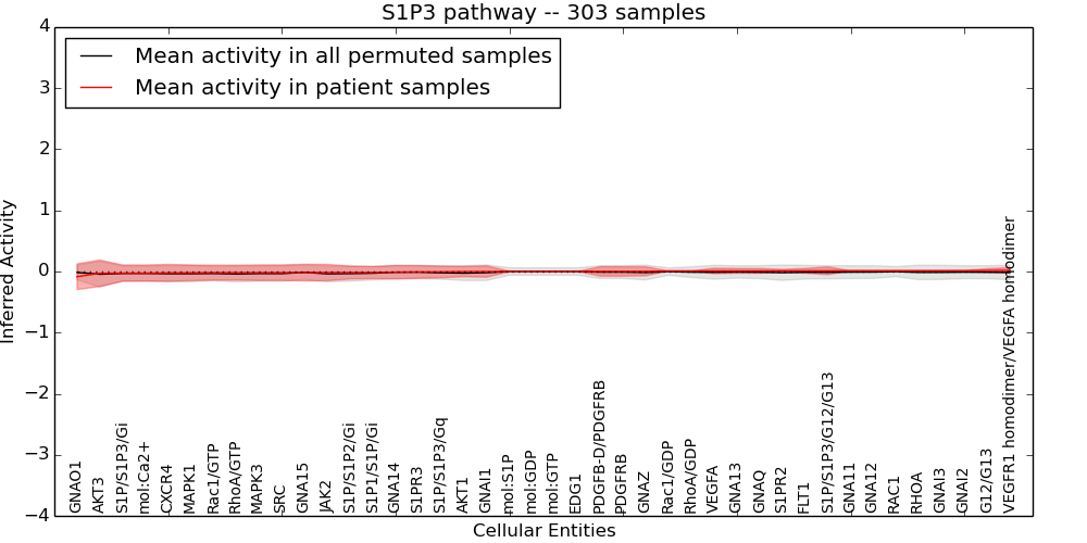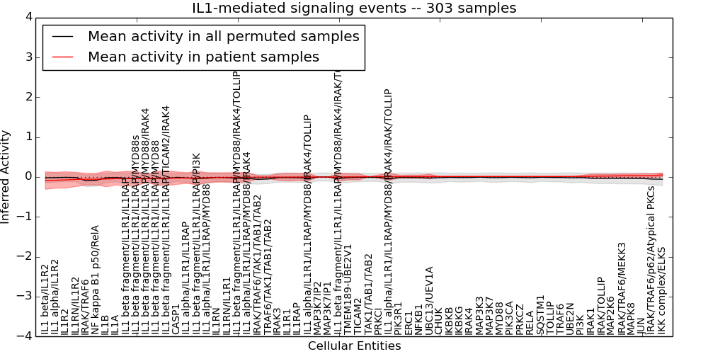 Figure S131. Get High-res Image This plot shows pathway concept perturbations across all samples against a permutation model. The concepts along the x-axis are sorted by lowest to highest mean activity for the real patient samples. Mean inferred activities are plotted along the y-axis as a colored band showing the average level and one standard deviation range. Real samples are shown in red and permuted samples in black.