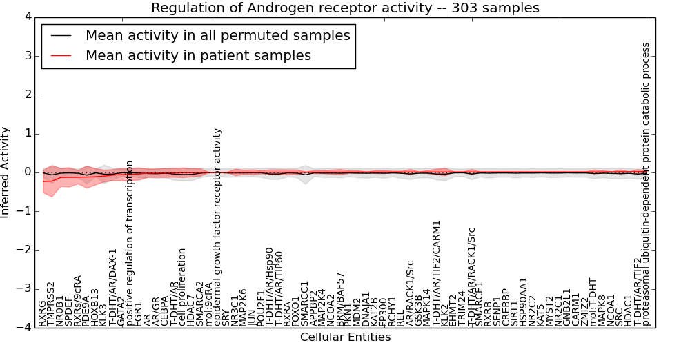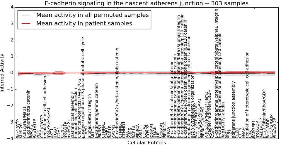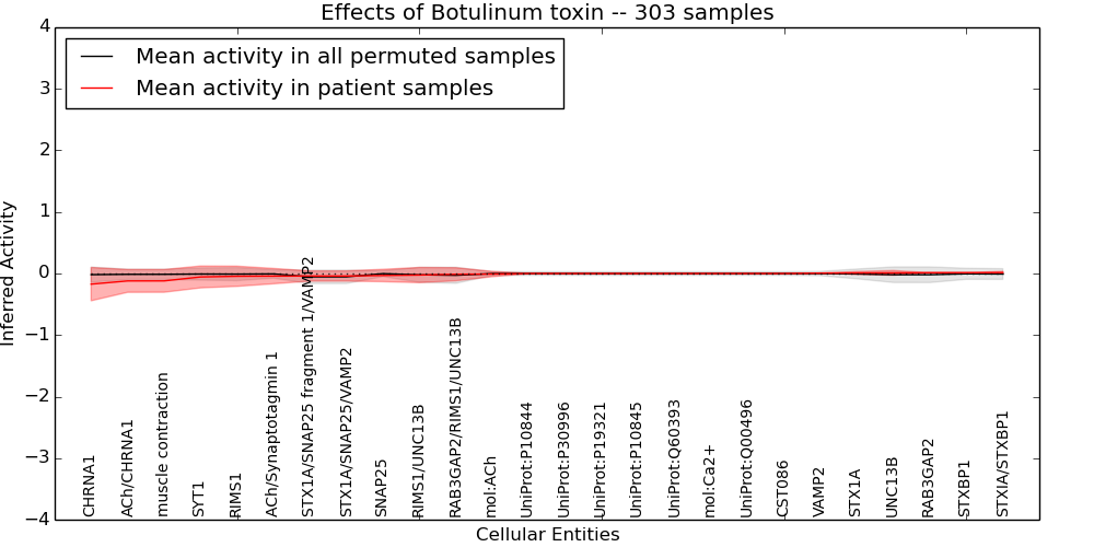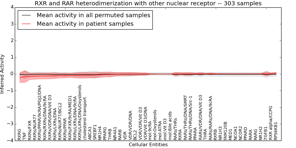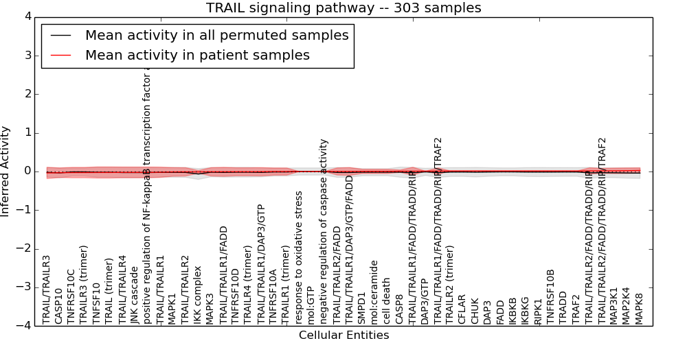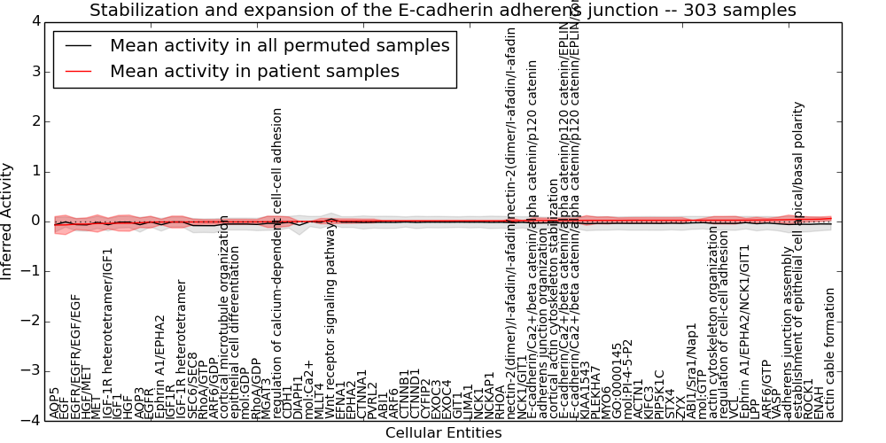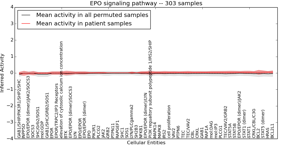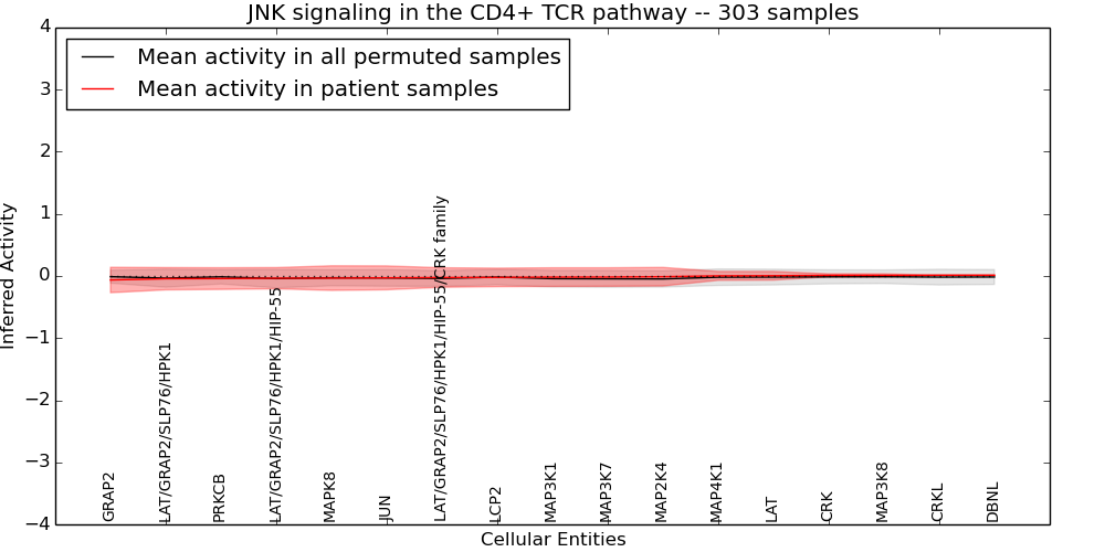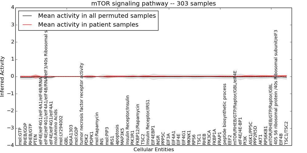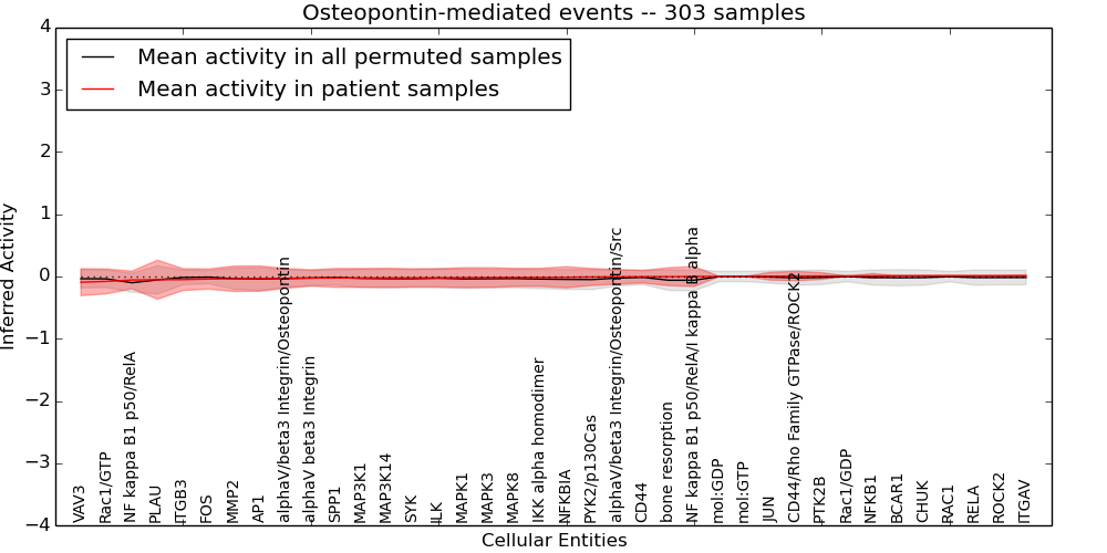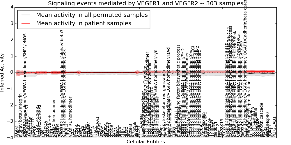 Figure S131. Get High-res Image This plot shows pathway concept perturbations across all samples against a permutation model. The concepts along the x-axis are sorted by lowest to highest mean activity for the real patient samples. Mean inferred activities are plotted along the y-axis as a colored band showing the average level and one standard deviation range. Real samples are shown in red and permuted samples in black.