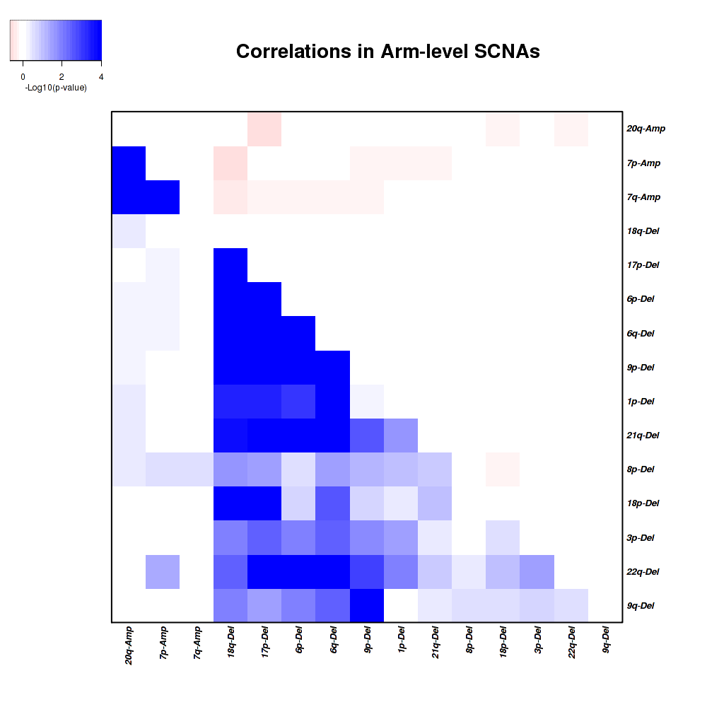 Figure 1.  Get High-res Image Co-occurring and mutually-exclusive pairs for copy number variations of arm level events. Blue means two events are co-occurring and red means two events are mutually-exclusive.