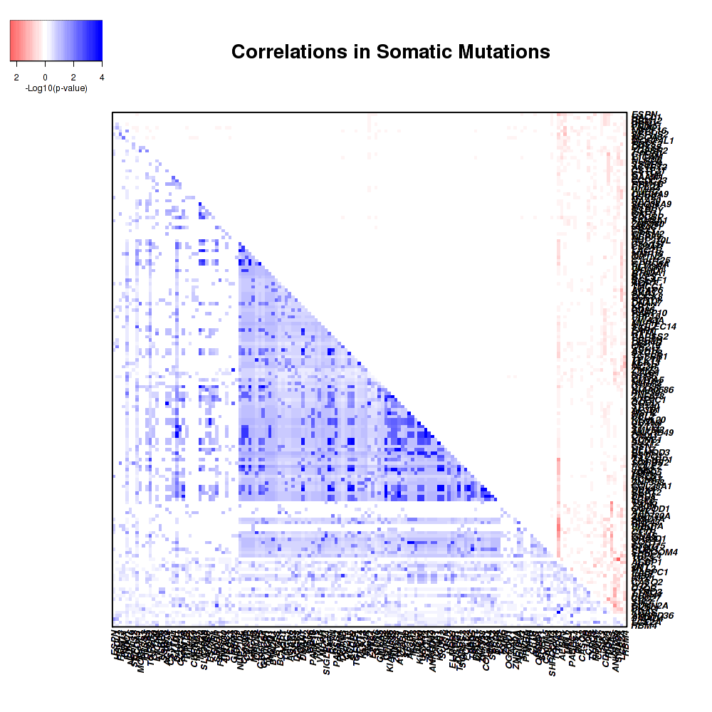 Figure 3.  Get High-res Image Co-occurring and mutually-exclusive pairs for significantly mutated genes. Blue means two events are co-occurring and red means two events are mutually-exclusive.