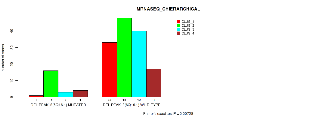 del_6q16.1 cnv correlated to 'RPPA_CNMF', 'MRNASEQ_CNMF', 'MRNASEQ_CHIERARCHICAL', 'MIRSEQ_CNMF', and 'MIRSEQ_CHIERARCHICAL'.