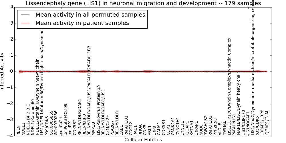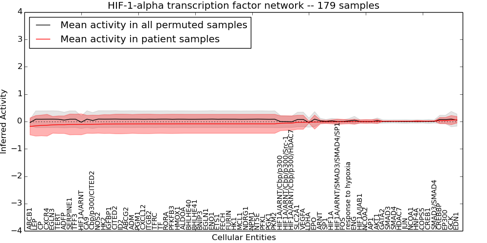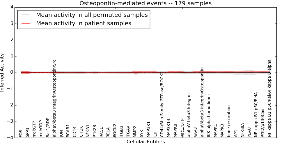 Figure S131. Get High-res Image This plot shows pathway concept perturbations across all samples against a permutation model. The concepts along the x-axis are sorted by lowest to highest mean activity for the real patient samples. Mean inferred activities are plotted along the y-axis as a colored band showing the average level and one standard deviation range. Real samples are shown in red and permuted samples in black.