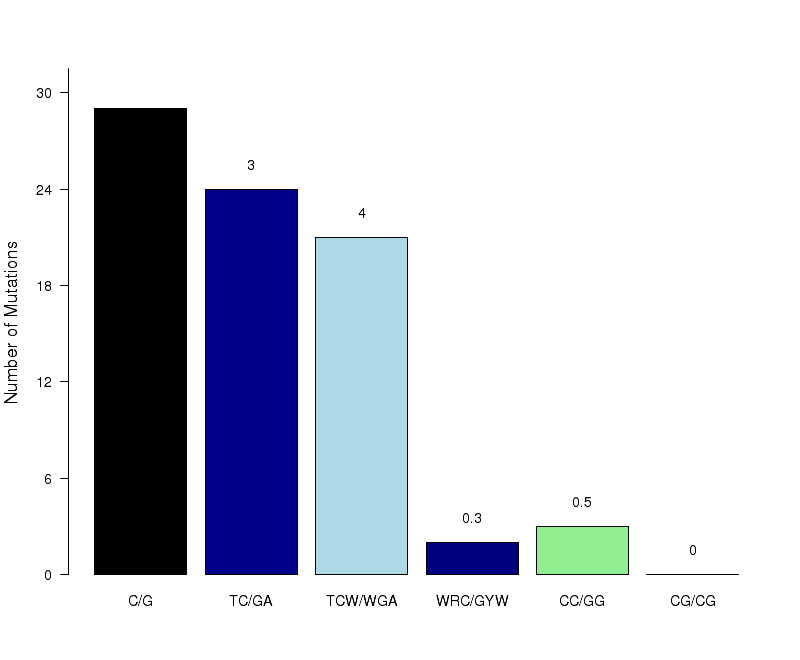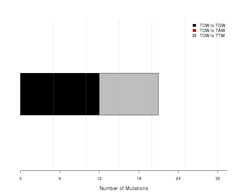 Figure 8. Get High-res Image The number of mutations categorized into three possible types of substitutions at the tCw motif (complementary mutations included) within C- or G-coordinated clusters. Numbers are calculated using the “Totals” row in the corresponding columns of the “*_sorted_sum_G_C_clusters.txt” file. Mutations caused by cytidine deamination in stretches of ssDNA caused by APOBEC mutagenesis are expected to be predominantly C-->T or C-->G with very few C-->A. Base substitution categories are shown within TCW context.