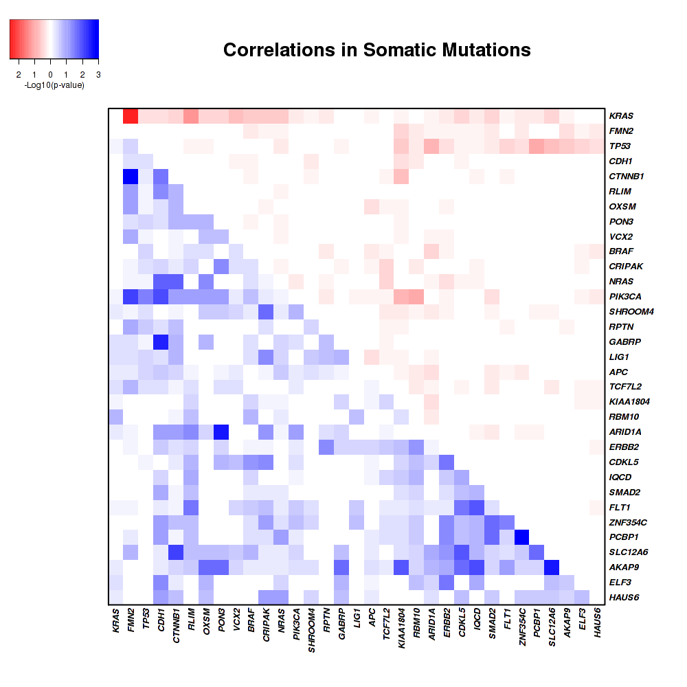 Figure 3. Get High-res Image Co-occurring and mutually-exclusive pairs for significantly mutated genes. Blue means two events are co-occurring and red means two events are mutually-exclusive.