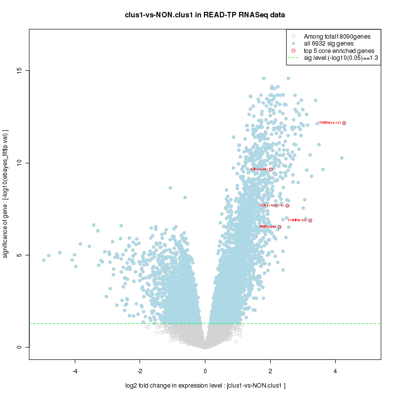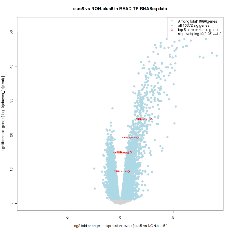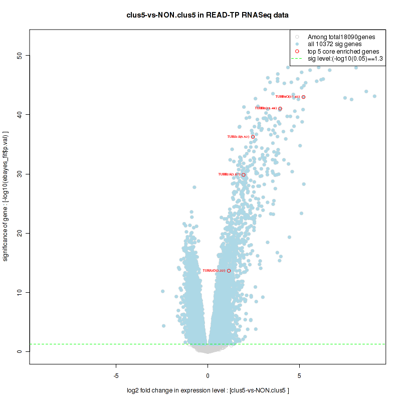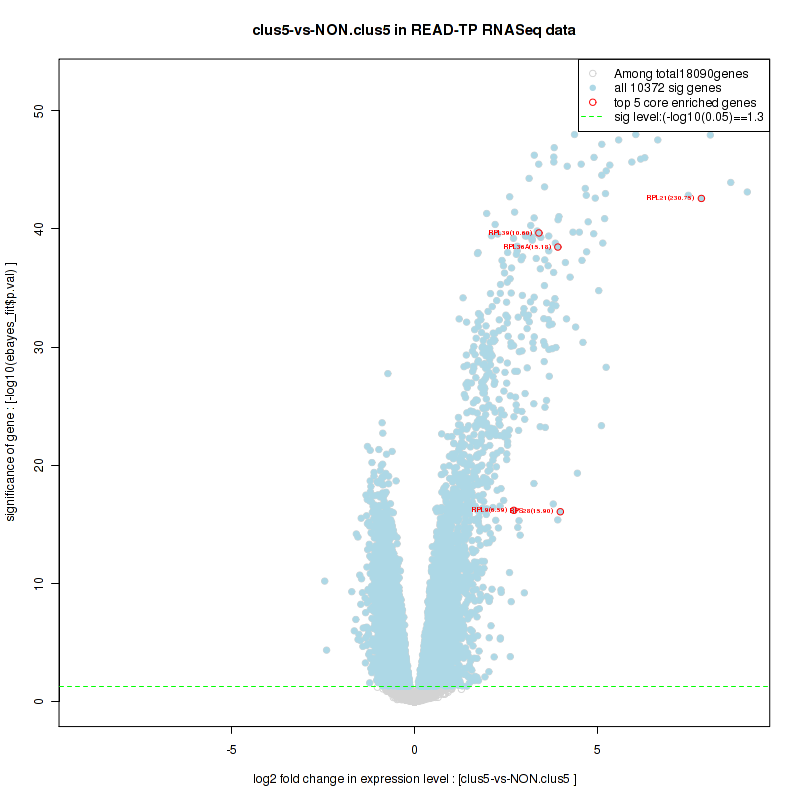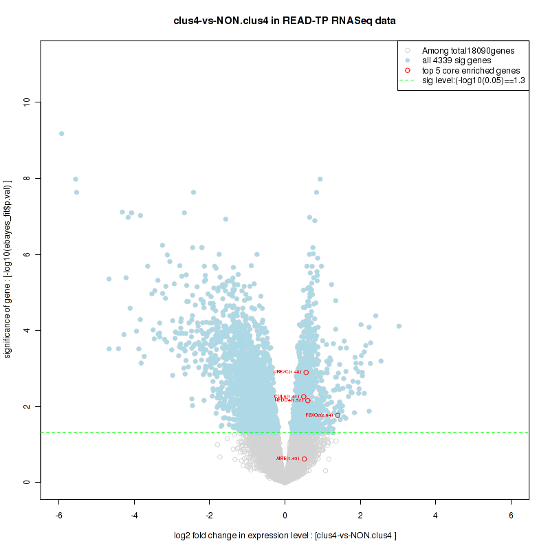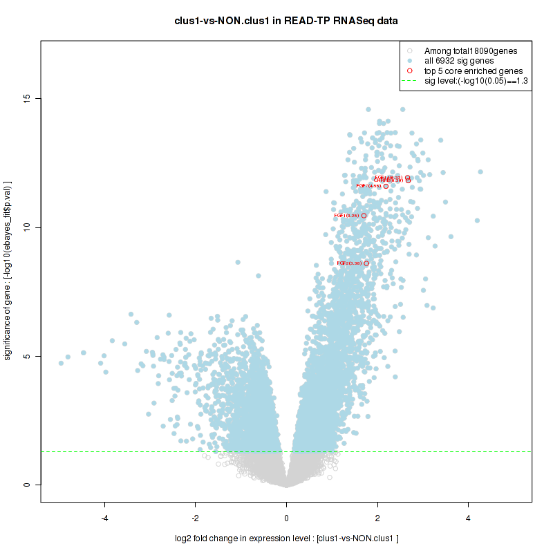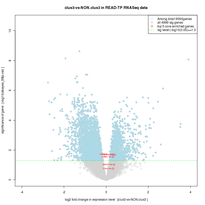 Figure S2. Get High-res Image For the top 5 core enriched genes in the pathway: BIOCARTA NO1 PATHWAY, this volcano plot shows how much they are up/down-regulated and significant. The significance was calculated by empirical bayesian fit