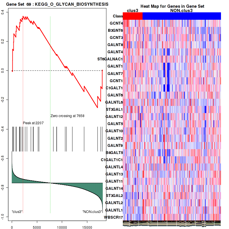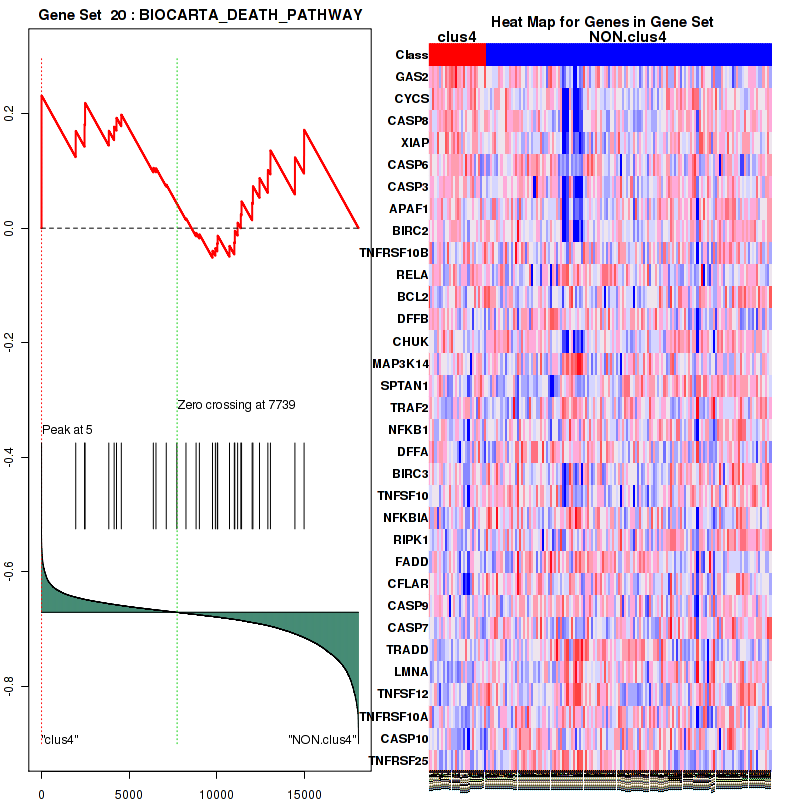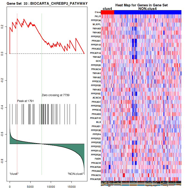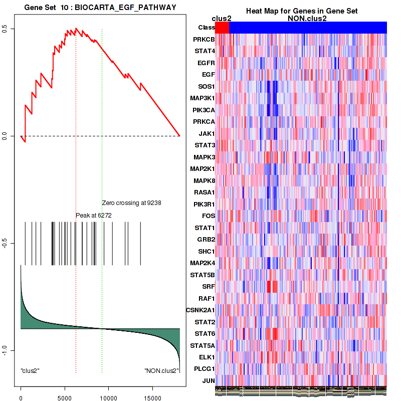Table S1. Get Full Table This table shows a Running Enrichment Score (RES) of each gene in this pathway, that is, the enrichment score at this point in the ranked list of genes. All genes are ranked by Signal-to-Noise (S2N), a measure of similarity as default and are used to obtain ES matrix of all genes. In this way, GSEA tool uses expression pattern of not only overlapped genes but also not-overlapped genes to produce ES matrix.