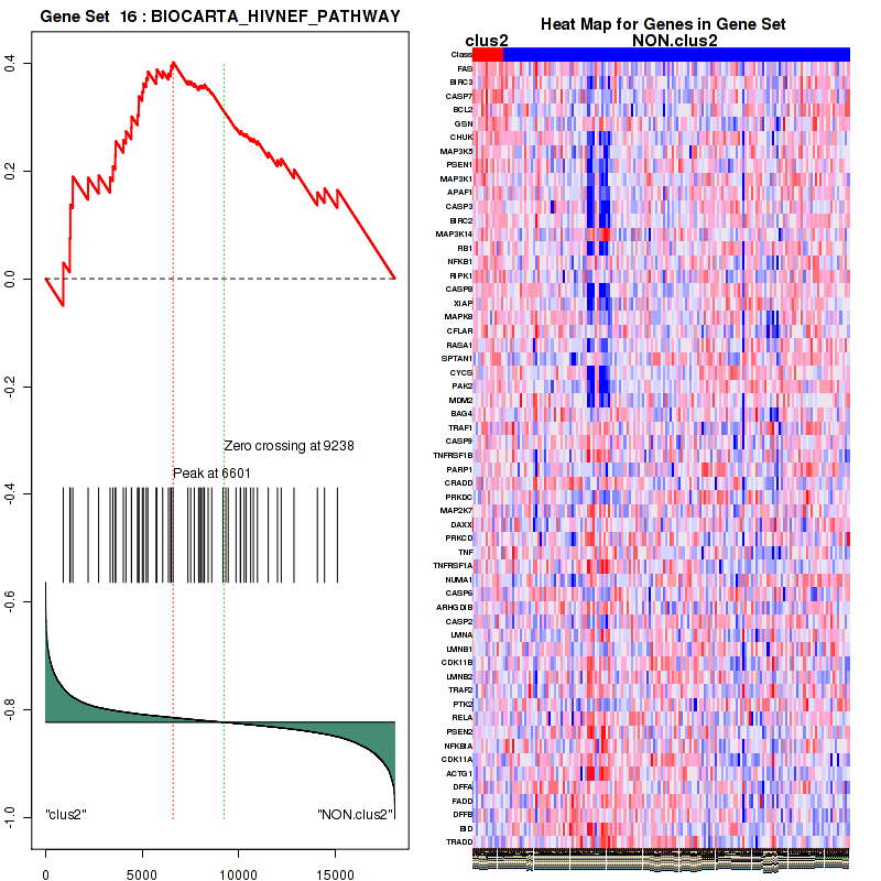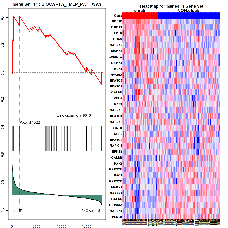 Table S2. Get Full Table This table shows a Running Enrichment Score (RES) of each gene in this pathway, that is, the enrichment score at this point in the ranked list of genes. All genes are ranked by Signal-to-Noise (S2N), a measure of similarity as default and are used to obtain ES matrix of all genes. In this way, GSEA tool uses expression pattern of not only overlapped genes but also not-overlapped genes to produce ES matrix.