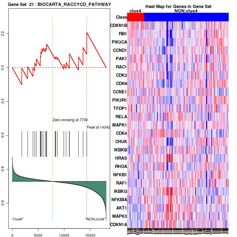 Figure S1. Get High-res Image This plot shows mRNAseq_cNMF expression data heatmap (on the left) a RunningEnrichmentScore(RES) plot (on the top right) and a Signal2Noise(S2N) plot (on the bottom right) of genes in the pathway: BIOCARTA NO1 PATHWAY.