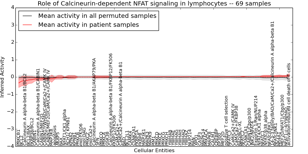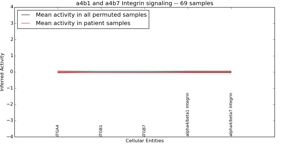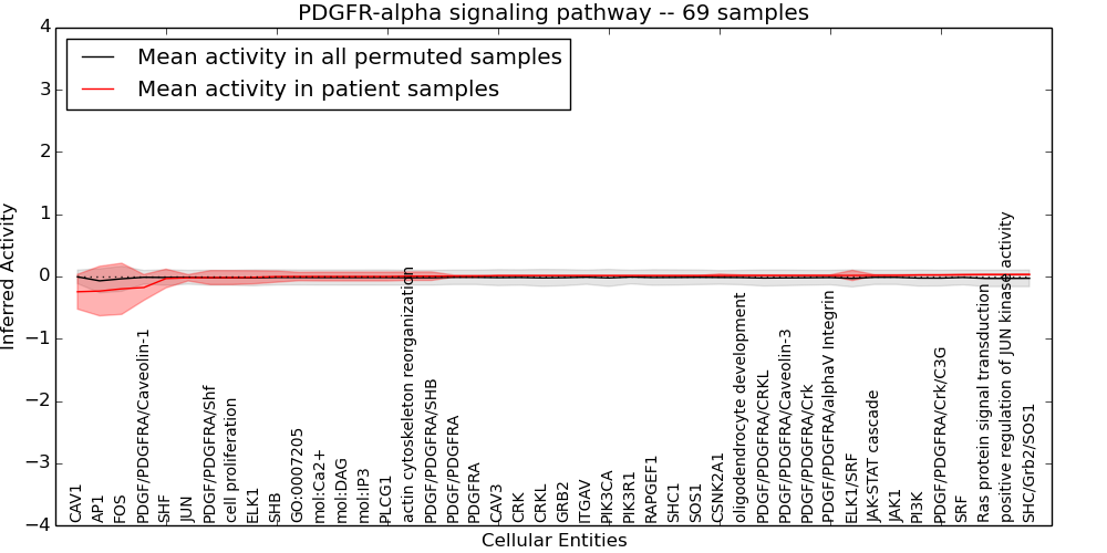 Figure S131. Get High-res Image This plot shows pathway concept perturbations across all samples against a permutation model. The concepts along the x-axis are sorted by lowest to highest mean activity for the real patient samples. Mean inferred activities are plotted along the y-axis as a colored band showing the average level and one standard deviation range. Real samples are shown in red and permuted samples in black.