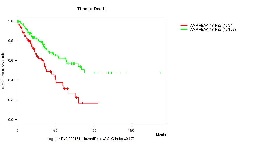 amp_1p32.1 cnv correlated to 'Time to Death', 'YEARS_TO_BIRTH', 'TUMOR_TISSUE_SITE', 'RADIATION_THERAPY', and 'HISTOLOGICAL_TYPE'.