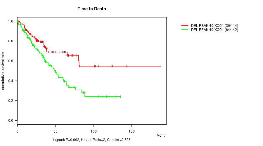 Figure S176. Get High-res Image Gene #65: 'del_xq21.1' versus Clinical Feature #1: 'Time to Death'