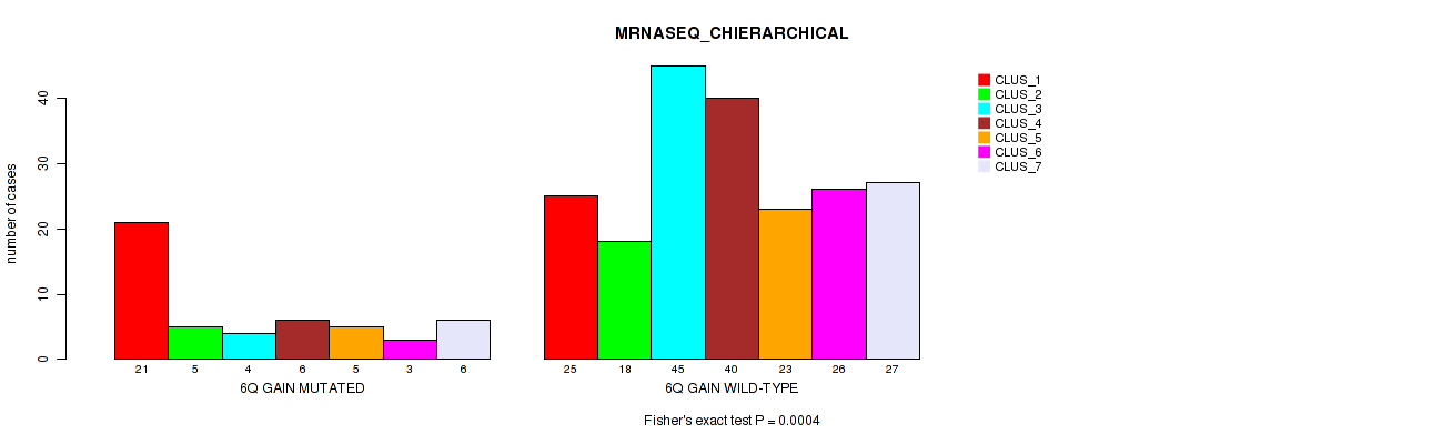 6q gain cnv correlated to 'CN_CNMF', 'METHLYATION_CNMF', 'RPPA_CNMF', 'RPPA_CHIERARCHICAL', 'MRNASEQ_CNMF', 'MRNASEQ_CHIERARCHICAL', 'MIRSEQ_CHIERARCHICAL', and 'MIRSEQ_MATURE_CHIERARCHICAL'.