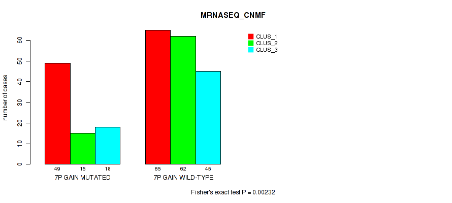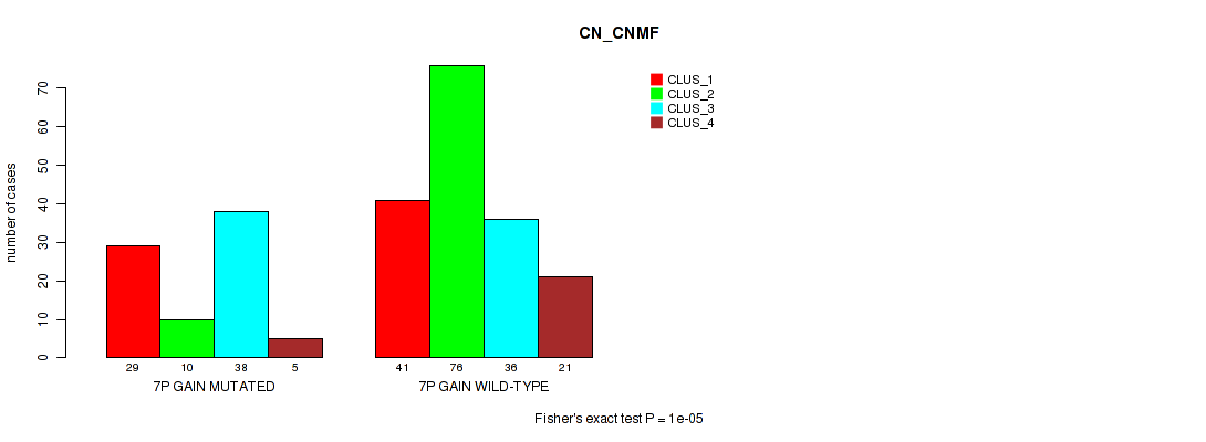 7p gain cnv correlated to 'CN_CNMF', 'METHLYATION_CNMF', 'RPPA_CNMF', 'RPPA_CHIERARCHICAL', 'MRNASEQ_CNMF', 'MRNASEQ_CHIERARCHICAL', 'MIRSEQ_MATURE_CNMF', and 'MIRSEQ_MATURE_CHIERARCHICAL'.