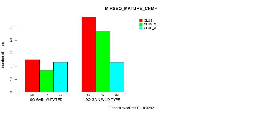 9q gain cnv correlated to 'CN_CNMF', 'METHLYATION_CNMF', 'RPPA_CNMF', 'RPPA_CHIERARCHICAL', 'MRNASEQ_CNMF', 'MRNASEQ_CHIERARCHICAL', 'MIRSEQ_CHIERARCHICAL', 'MIRSEQ_MATURE_CNMF', and 'MIRSEQ_MATURE_CHIERARCHICAL'.