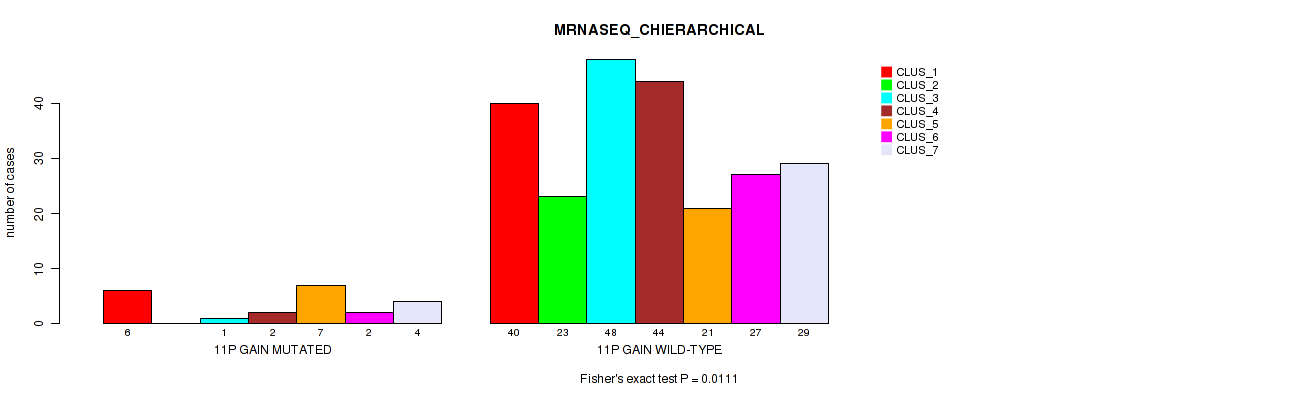 11p gain cnv correlated to 'CN_CNMF', 'METHLYATION_CNMF', and 'MRNASEQ_CHIERARCHICAL'.