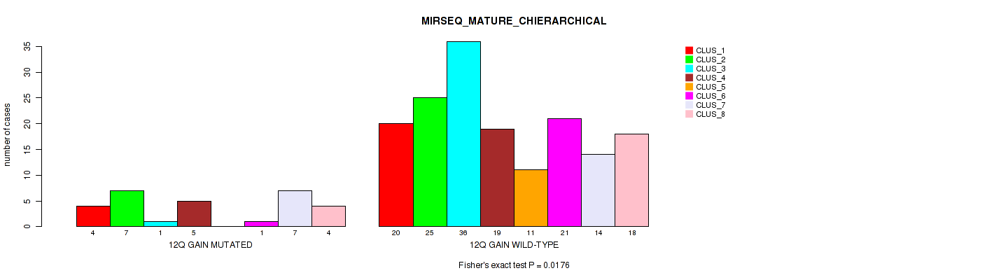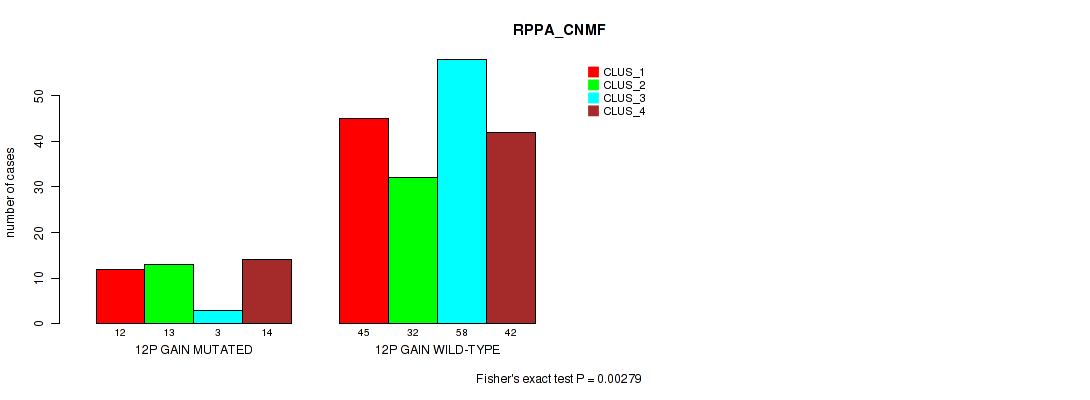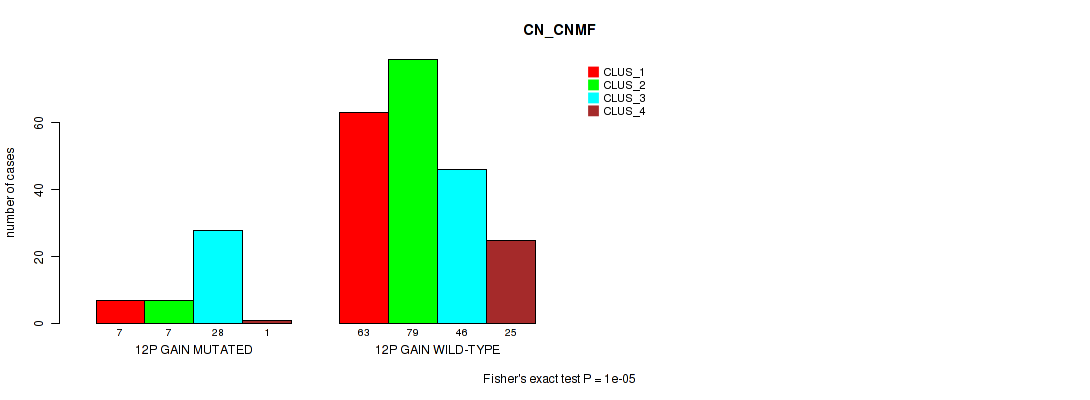 12p gain cnv correlated to 'CN_CNMF', 'METHLYATION_CNMF', 'RPPA_CNMF', 'RPPA_CHIERARCHICAL', 'MRNASEQ_CNMF', 'MRNASEQ_CHIERARCHICAL', 'MIRSEQ_MATURE_CNMF', and 'MIRSEQ_MATURE_CHIERARCHICAL'.