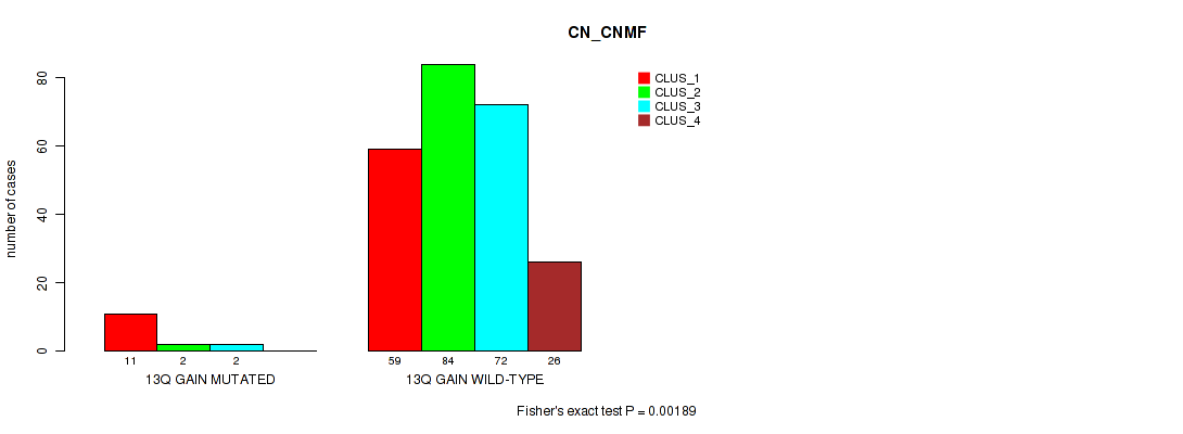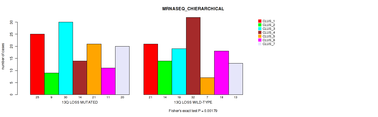 13q loss cnv correlated to 'CN_CNMF', 'METHLYATION_CNMF', 'RPPA_CHIERARCHICAL', and 'MRNASEQ_CHIERARCHICAL'.