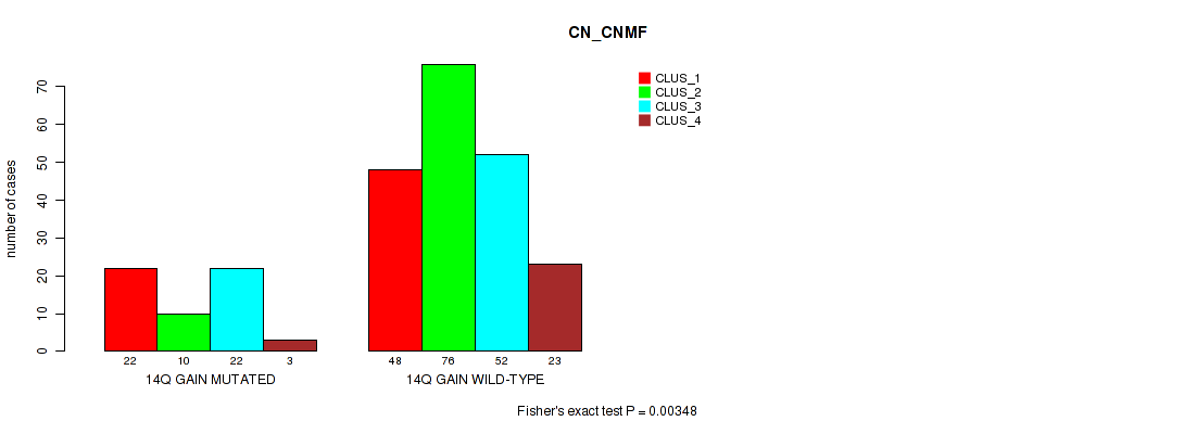 14q gain cnv correlated to 'CN_CNMF', 'METHLYATION_CNMF', 'RPPA_CHIERARCHICAL', and 'MRNASEQ_CHIERARCHICAL'.