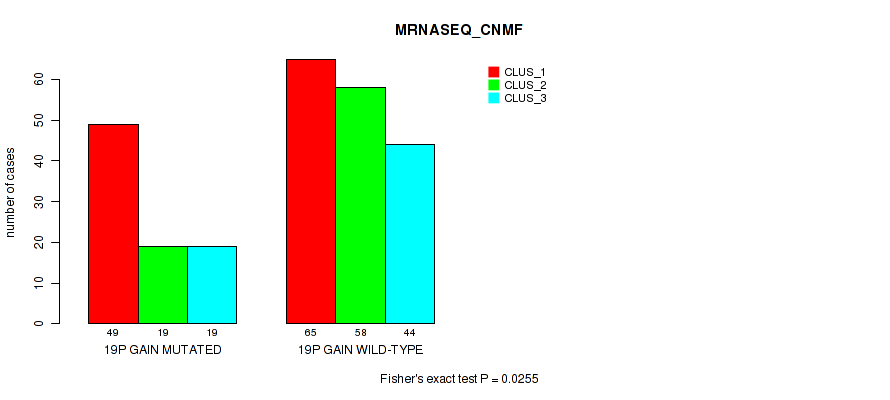19p gain cnv correlated to 'CN_CNMF', 'METHLYATION_CNMF', 'RPPA_CHIERARCHICAL', 'MRNASEQ_CNMF', and 'MRNASEQ_CHIERARCHICAL'.
