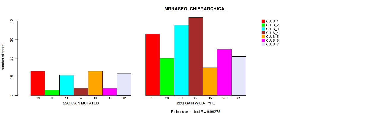 22q gain cnv correlated to 'CN_CNMF', 'METHLYATION_CNMF', 'RPPA_CNMF', 'RPPA_CHIERARCHICAL', 'MRNASEQ_CNMF', and 'MRNASEQ_CHIERARCHICAL'.