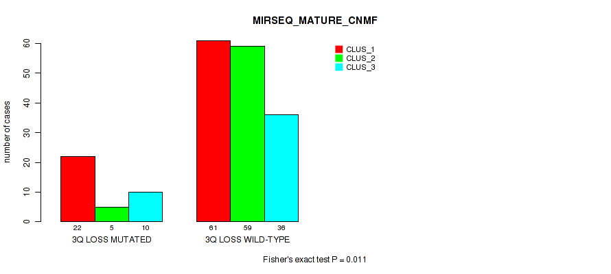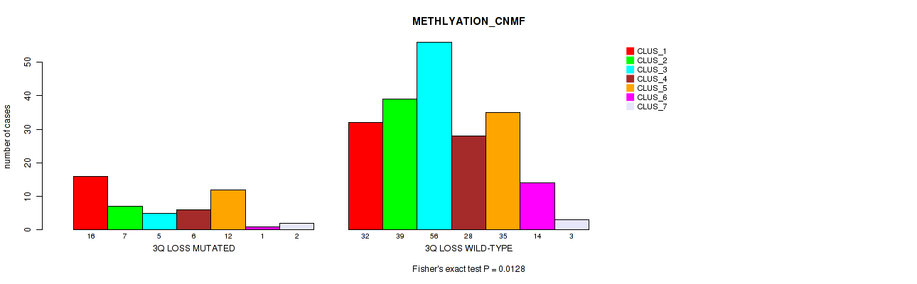 3q loss cnv correlated to 'CN_CNMF', 'METHLYATION_CNMF', 'RPPA_CNMF', 'MRNASEQ_CNMF', 'MIRSEQ_CNMF', 'MIRSEQ_CHIERARCHICAL', 'MIRSEQ_MATURE_CNMF', and 'MIRSEQ_MATURE_CHIERARCHICAL'.