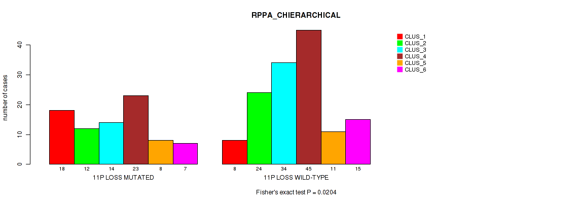 11p loss cnv correlated to 'CN_CNMF', 'METHLYATION_CNMF', and 'RPPA_CHIERARCHICAL'.