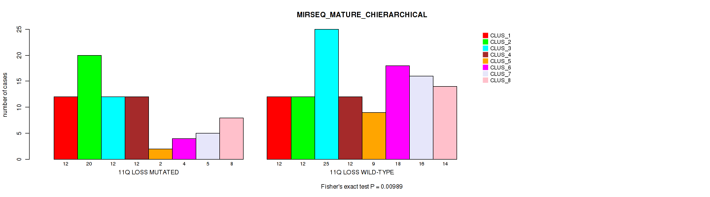 11q loss cnv correlated to 'CN_CNMF', 'METHLYATION_CNMF', 'RPPA_CHIERARCHICAL', 'MRNASEQ_CHIERARCHICAL', and 'MIRSEQ_MATURE_CHIERARCHICAL'.