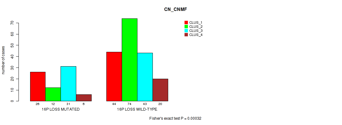 16p loss cnv correlated to 'CN_CNMF', 'METHLYATION_CNMF', and 'RPPA_CHIERARCHICAL'.