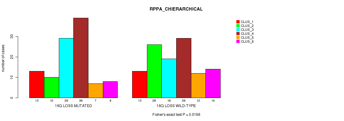 16q loss cnv correlated to 'CN_CNMF', 'METHLYATION_CNMF', 'RPPA_CNMF', 'RPPA_CHIERARCHICAL', 'MRNASEQ_CNMF', 'MRNASEQ_CHIERARCHICAL', 'MIRSEQ_CNMF', 'MIRSEQ_CHIERARCHICAL', 'MIRSEQ_MATURE_CNMF', and 'MIRSEQ_MATURE_CHIERARCHICAL'.