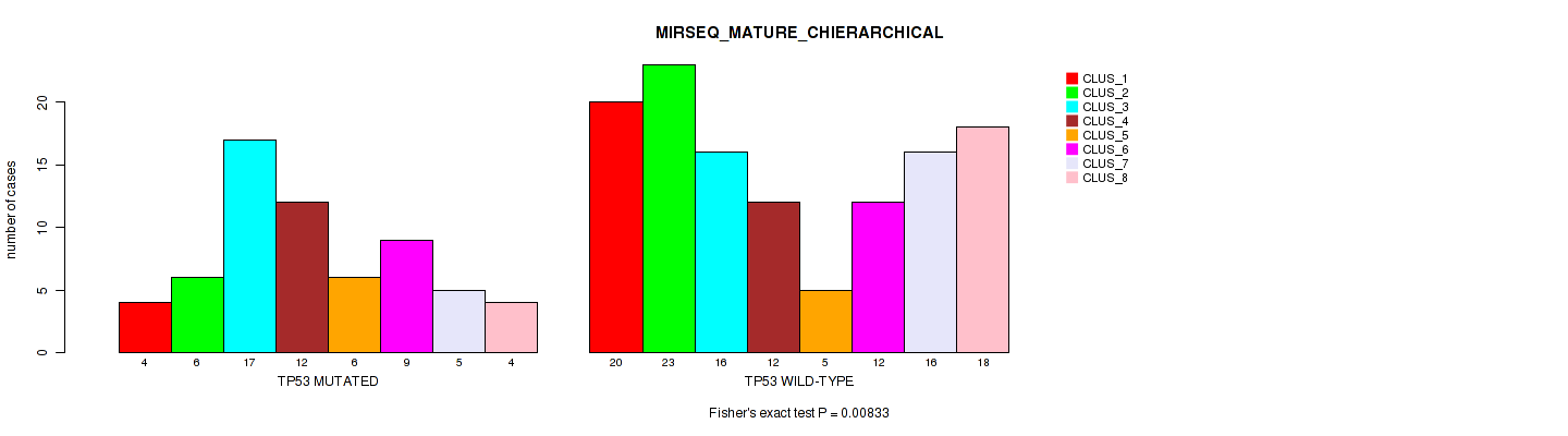 TP53 mutation correlated to 'CN_CNMF', 'METHLYATION_CNMF', 'RPPA_CNMF', 'MRNASEQ_CNMF', 'MRNASEQ_CHIERARCHICAL', 'MIRSEQ_CNMF', 'MIRSEQ_CHIERARCHICAL', 'MIRSEQ_MATURE_CNMF', and 'MIRSEQ_MATURE_CHIERARCHICAL'.