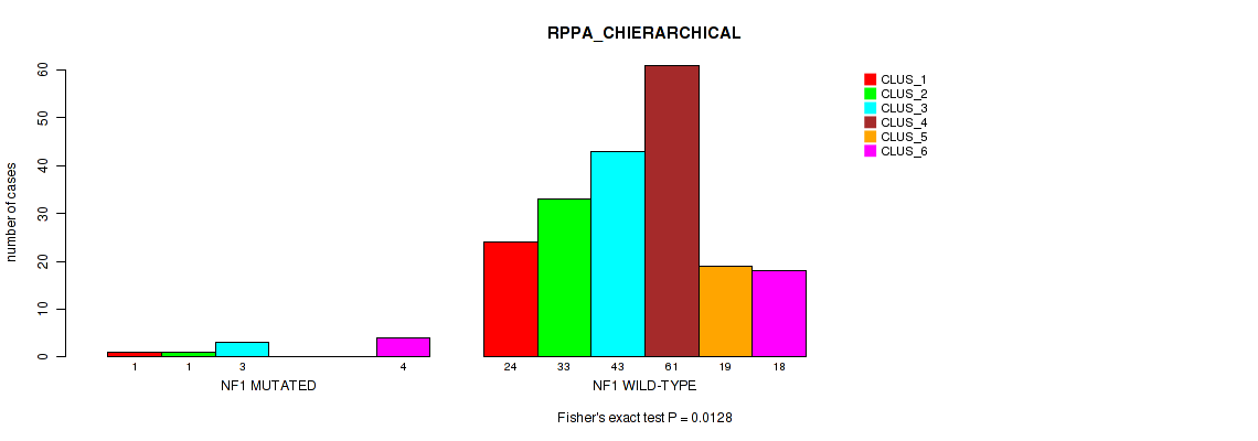 NF1 mutation correlated to 'RPPA_CHIERARCHICAL', 'MRNASEQ_CHIERARCHICAL', and 'MIRSEQ_MATURE_CHIERARCHICAL'.