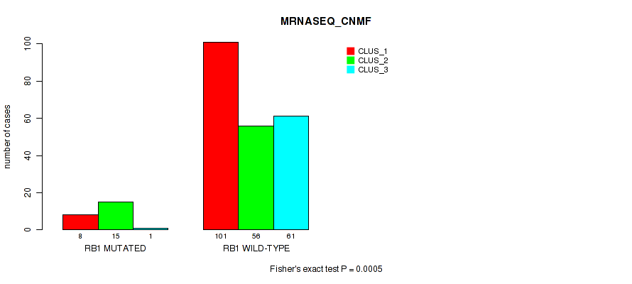 RB1 mutation correlated to 'METHLYATION_CNMF', 'MRNASEQ_CNMF', 'MRNASEQ_CHIERARCHICAL', 'MIRSEQ_CNMF', 'MIRSEQ_CHIERARCHICAL', 'MIRSEQ_MATURE_CNMF', and 'MIRSEQ_MATURE_CHIERARCHICAL'.