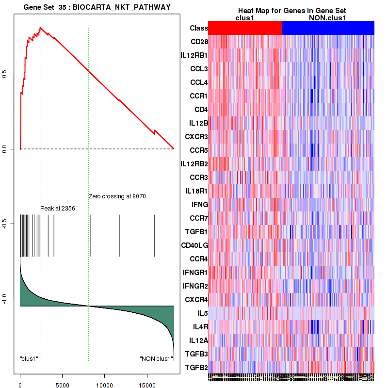 Table S30. Get Full Table This table shows a Running Enrichment Score (RES) of each gene in this pathway, that is, the enrichment score at this point in the ranked list of genes. All genes are ranked by Signal-to-Noise (S2N), a measure of similarity as default and are used to obtain ES matrix of all genes. In this way, GSEA tool uses expression pattern of not only overlapped genes but also not-overlapped genes to produce ES matrix.