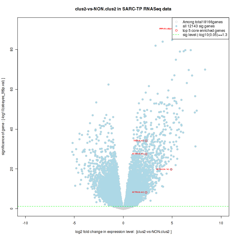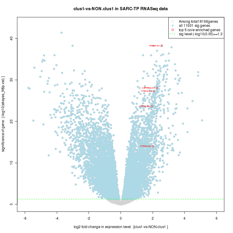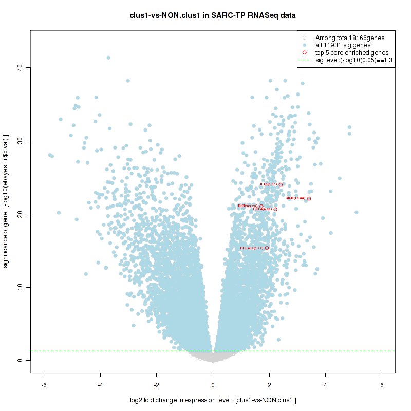 Figure S2. Get High-res Image For the top 5 core enriched genes in the pathway: BIOCARTA BCR PATHWAY, this volcano plot shows how much they are up/down-regulated and significant. The significance was calculated by empirical bayesian fit