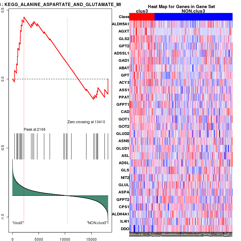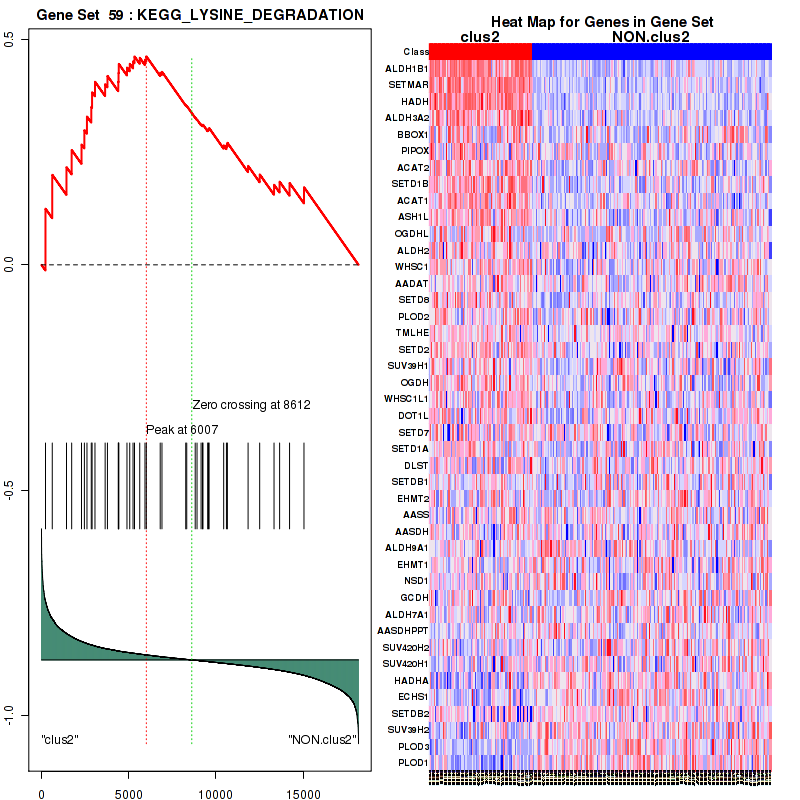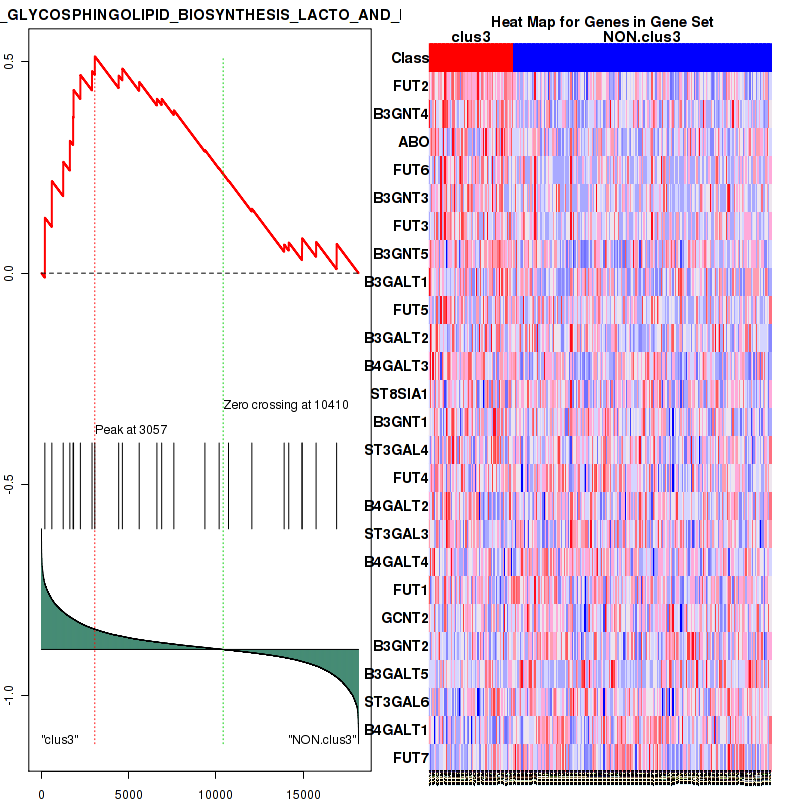 Table S1. Get Full Table This table shows a Running Enrichment Score (RES) of each gene in this pathway, that is, the enrichment score at this point in the ranked list of genes. All genes are ranked by Signal-to-Noise (S2N), a measure of similarity as default and are used to obtain ES matrix of all genes. In this way, GSEA tool uses expression pattern of not only overlapped genes but also not-overlapped genes to produce ES matrix.