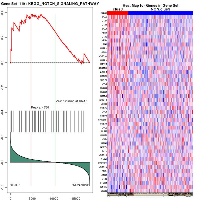 Figure S59. Get High-res Image This plot shows mRNAseq_cNMF expression data heatmap (on the left) a RunningEnrichmentScore(RES) plot (on the top right) and a Signal2Noise(S2N) plot (on the bottom right) of genes in the pathway: KEGG NOTCH SIGNALING PATHWAY.