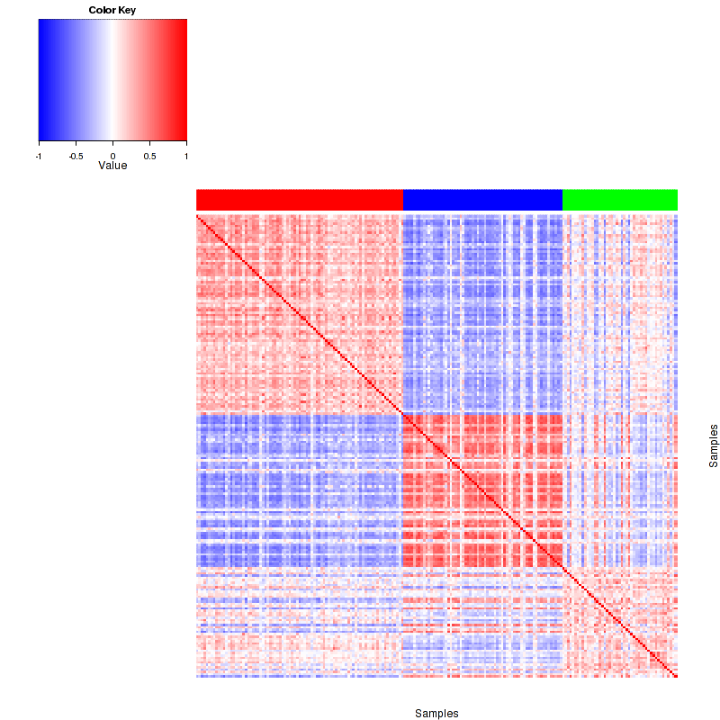 Figure 4. The consensus matrix after clustering shows 3 robust clusters with limited overlap between clusters.
